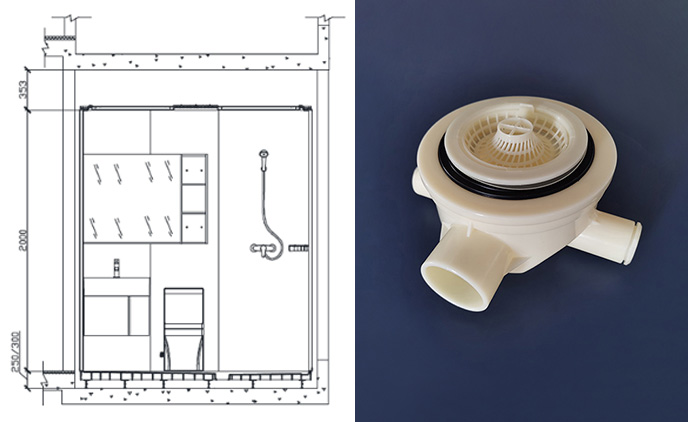 Using dry construction and "building blocks" installation, a complete bathroom can be installed in 4 hours.